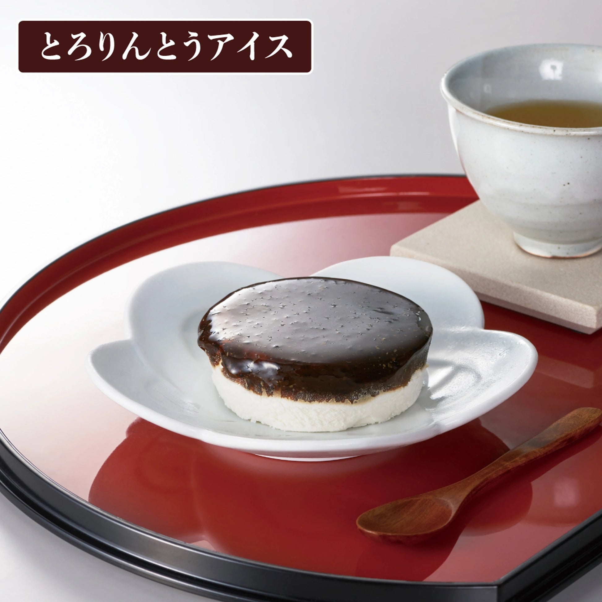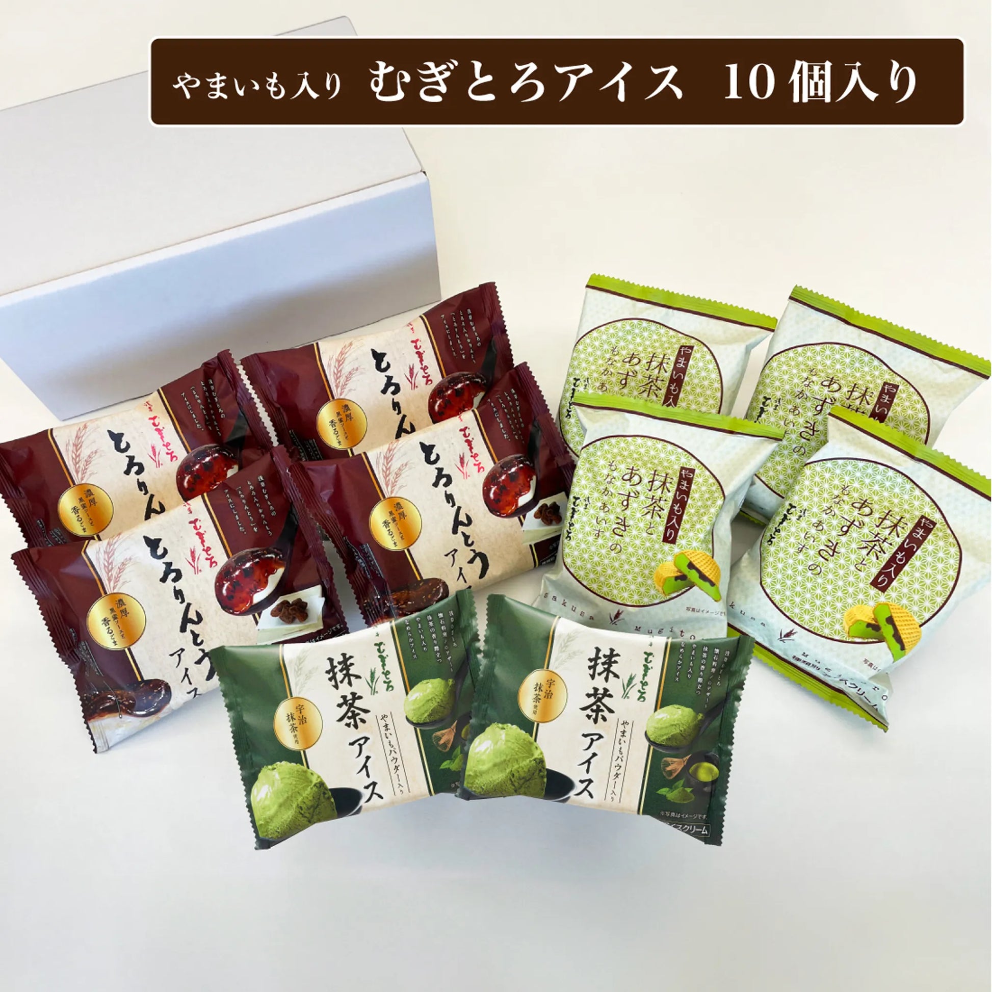 浅草むぎとろ本店デザートで人気の『やまいも入り 抹茶アイス(カップ)』と さくさく最中で包んだ『やまいも入り抹茶とあずきのもなかあいす』、人気のお菓子『とろりんとう』をイメージしたアイスを詰合せしました。